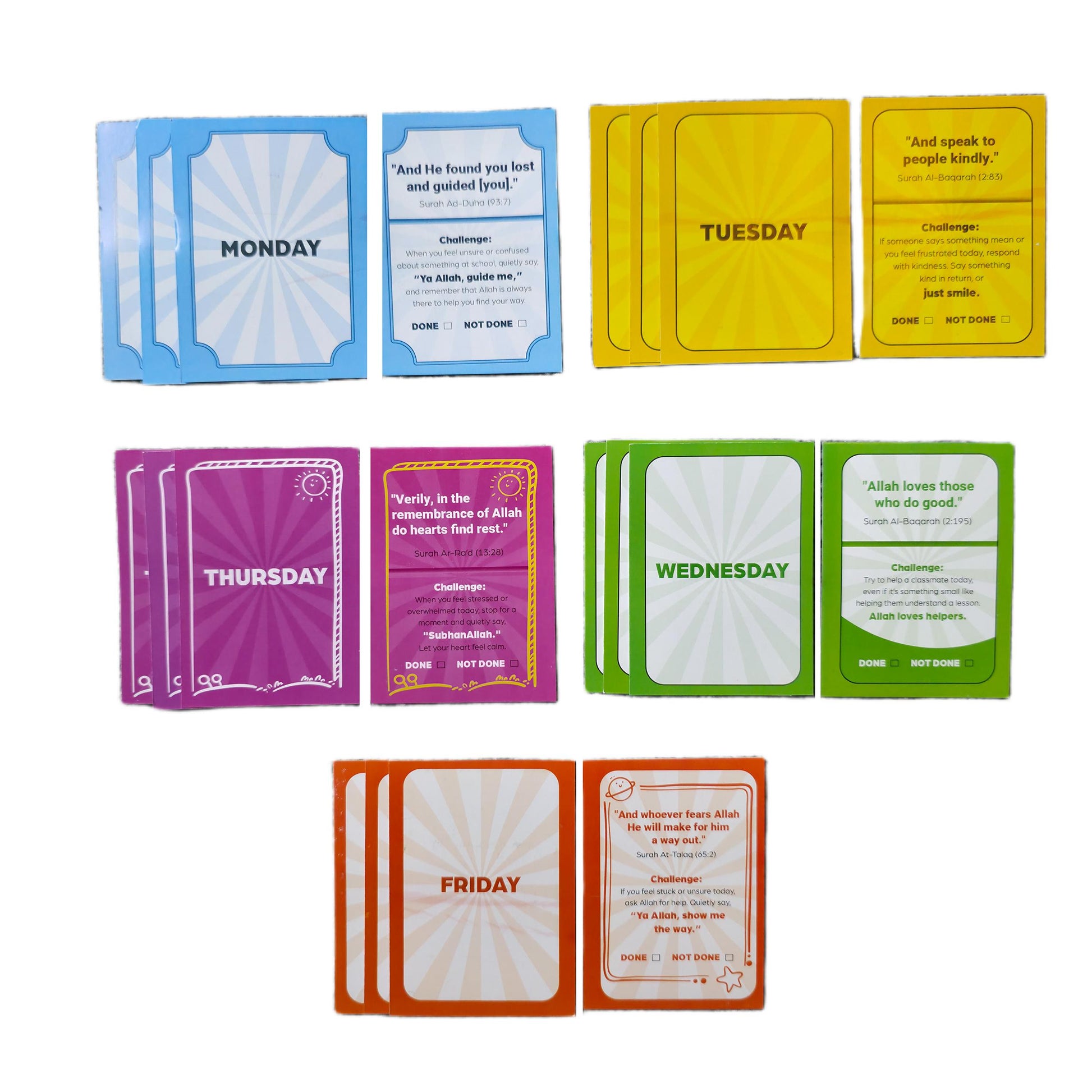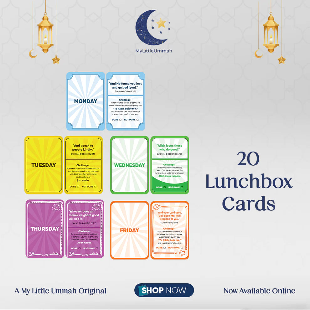 🍱 Daily Lunchbox Wisdom Cards: These cards provide daily Islamic teachings and reminders, perfect for slipping into a lunchbox to inspire and motivate children throughout their day.