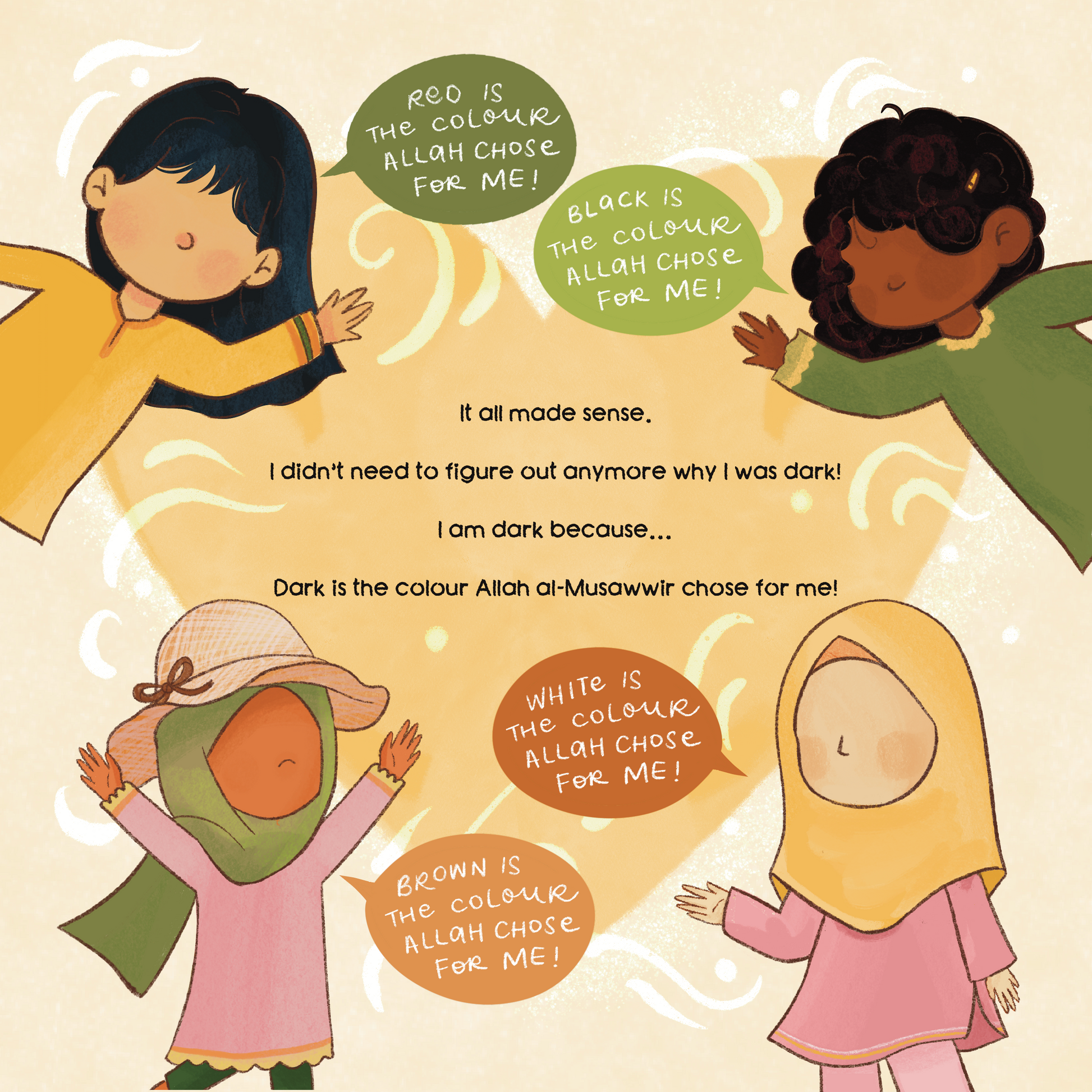 This isn't just a typical story based on skin colour.. rather it's a thought provoking story book written in an engaging manner which will make children understand that Allah, Al-Musawwir's creation is perfect.