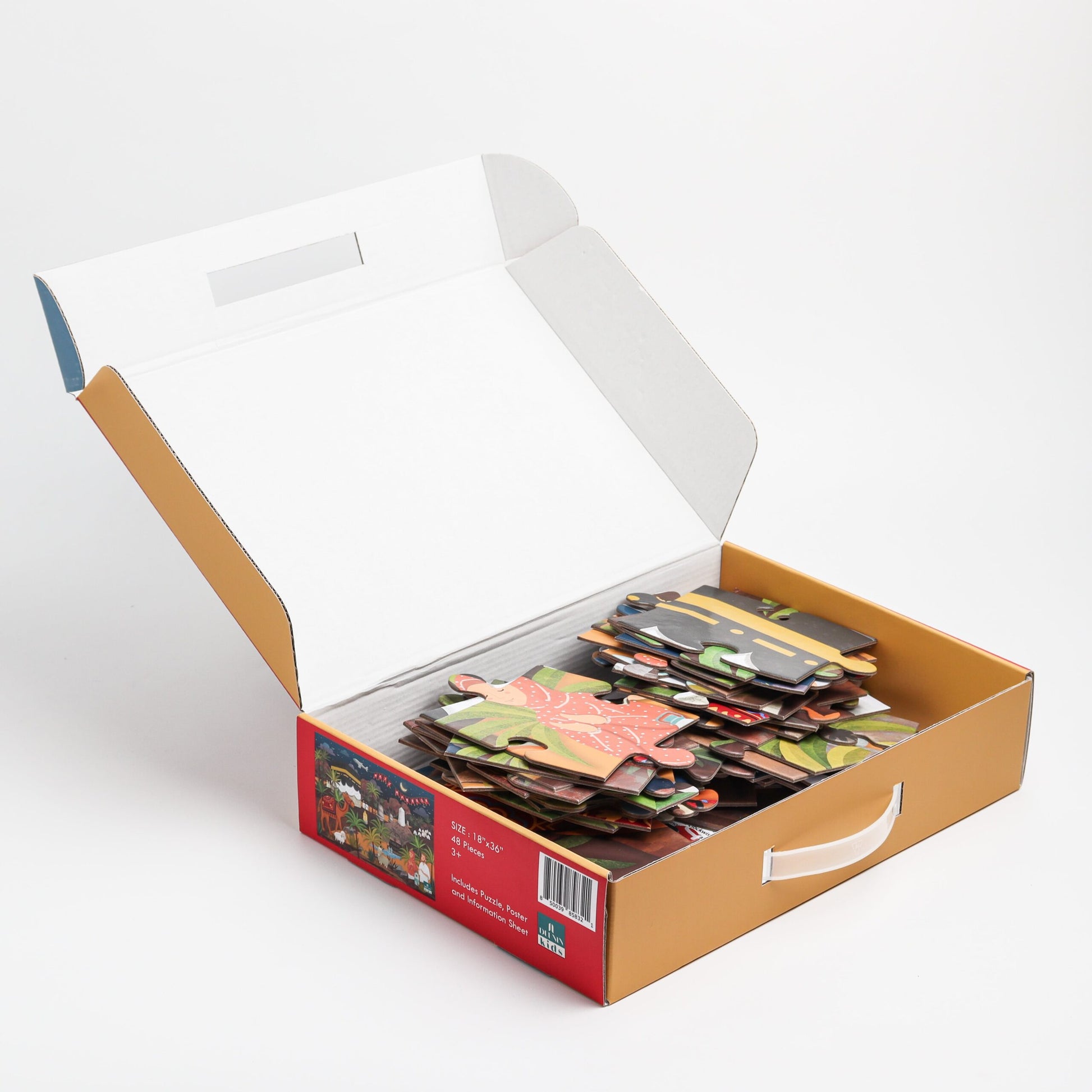 The finished puzzle measures a substantial 18″ x 36″ (1.5 feet x 3 feet), presenting a colorful and engaging depiction of the Hajj journey. Children can identify key stages, symbols, and rites of the Hajj pilgrimage, providing a great opportunity for parents to narrate and explain this significant Islamic tradition.