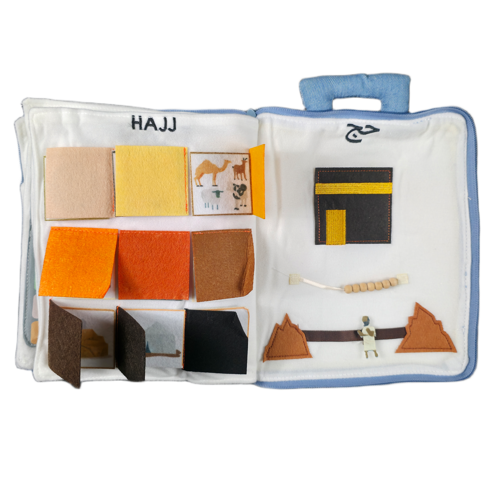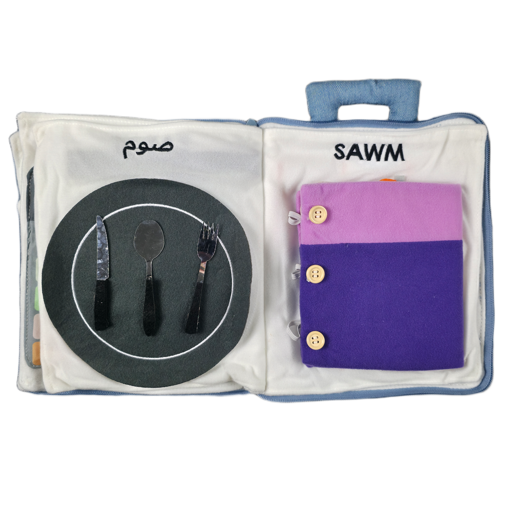 5 pillars of Islam is an interactive fabric quiet book to help children learn important Islamic foundations through visual stimulation and tactile sensation with the help of velcro, zip, magnet, buttons, laces, etc. There are 10 pages encouraging fun, hands-on learning of conditions of the shahada, positions of salah and its timings, sunnah foods to start or end the fast with, numerical literacy through zakat, and the rites of Hajj.